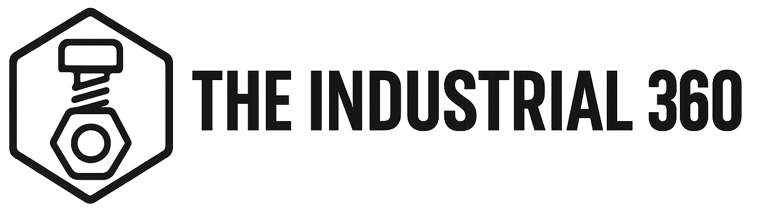 The logo features a bold, modern design in black. On the left side, a hexagonal outline encloses an icon of a bolt and nut, representing strength, durability, and industrial precision. To the right, the brand name “THE INDUSTRIAL 360” is written in strong, uppercase bold letters, emphasizing professionalism, reliability, and a 360-degree approach to industrial solutions. The single-line composition creates a sleek, balanced, and professional appearance, making it easily recognizable and versatile for branding.