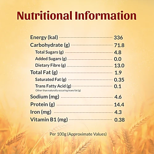 Nutrition_per: 100g Serving_Size: 60g Energy (kcal): 336 kcal Carbohydrate (g): 71.8 g Total Sugars (g): 4.8 g Added Sugars (g): 0.0 g Dietary Fibre (g): 13.0 g Total Fat (g): 1.9 g Saturated Fat (g): 0.35 g Trans Fatty Acid (g): 0.0 g Sodium (mg): 4.6 mg Protein (g): 14.4 g Iron (mg): 4.3 mg Vitamin B1 (mg): 0.38 mg