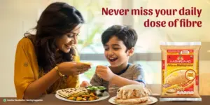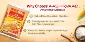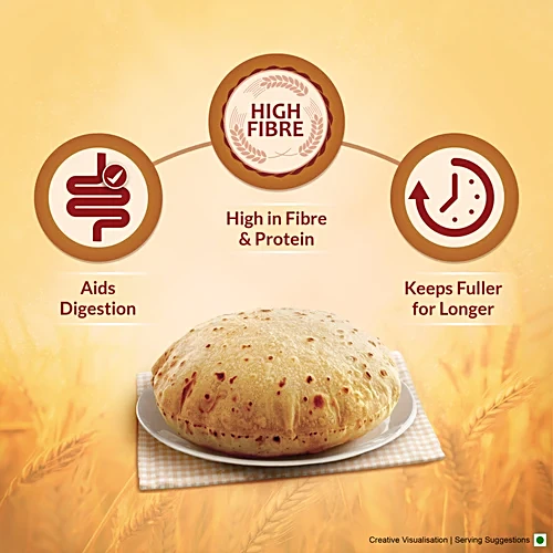 Aashirvaad Atta with Multigrains is a high-fibre, nutritious flour made from 6 grains including wheat, maize, oats, soya, channa, and psyllium husk. It supports easy digestion, keeps you fuller for longer, and helps reduce frequent hunger. Just 3 rotis provide up to 35% of daily fibre needs, making it ideal for a healthy lifestyle. Sourced from quality grains across India, this multigrain atta delivers soft, tasty chapatis, parathas, and pooris with the same great taste as regular atta.