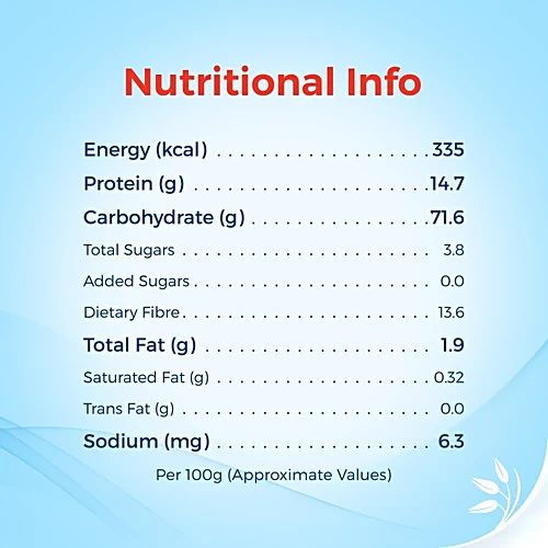 Nutrition_per: 100g Serving_Size: 60g Energy (kcal): 335 kcal Protein (g): 14.7 g Carbohydrate (g): 71.6 g Total Sugars (g): 3.8 g Added Sugars (g): 0.0 g Dietary Fibre (g): 13.6 g Total Fat (g): 1.9 g Saturated Fat (g): 0.32 g Trans Fat (g): 0.0 g Sodium (mg): 6.3 mg RDA: 10 (24)