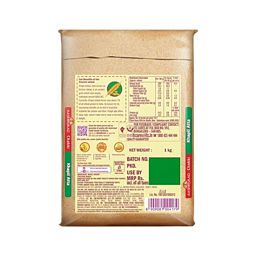 Aashirvaad Chakki Khapli Atta is a premium flour made from 100% pure emmer (Khapli) wheat, an ancient grain known for its rich nutrition. With high fibre and up to 30% more protein, it supports a healthy and balanced diet. Prepared using traditional chakki grinding, it helps retain natural nutrients and authentic taste. This high-quality atta delivers soft, flavourful rotis while combining traditional goodness with modern quality standards.