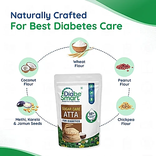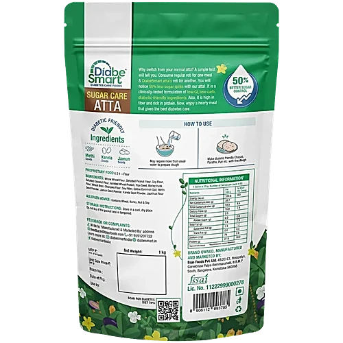 DiabeSmart Sugar Control Atta is a clinically tested, low glycemic index flour designed to support diabetes and blood sugar management. Made with natural Ayurvedic ingredients like methi, bitter gourd, and jamun, it helps reduce sugar spikes and ensures slow glucose release. Enriched with coconut, peanut, and chickpea flours, it provides balanced nutrition with high fibre and protein. Ideal for everyday use, this diabetic-friendly atta delivers soft, tasty rotis while promoting overall health and wellness.