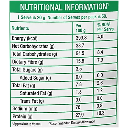 Nutrition per gram/ml: 100g Serving Size: 20 g Energy (kcal): 399.8 Net Carbohydrates (g): 38.7 Total Carbohydrates (g): 54.5 Dietary Fibre (g): 15.8 Total Sugars (g): 3.5 Added Sugar (g): 0.0 Total Fat (g): 7.8 Saturated Fat (g): 1.3 Trans Fat (g): 0.0 Sodium (mg): 76 Protein (g): 27.9