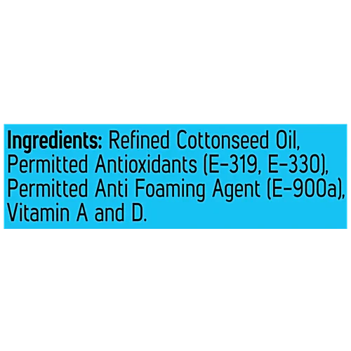 Refined Cottonseed Oil, Permitted Antioxidants (E-319, E-330), Permitted Anti Foaming Agent (E-900a), Vitamin A and D.