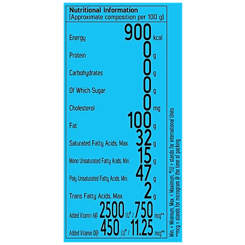 Nutrition per gram/ml: 100g Energy: 900 kcal Protein: 0 g Carbohydrates: 0 g Of Which Sugar: 0 g Cholesterol: 0 mg Fat: 100 g Saturated Fatty Acids, Max: 32 g Mono Unsaturated Fatty Acids, Min.: 15 g Poly Unsaturated Fatty Acids Min.: 47 g Trans Fatty Acids, Max.: 2 g Vitamin A: 2500 IU Vitamin D: 750 mcg