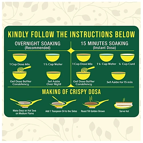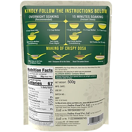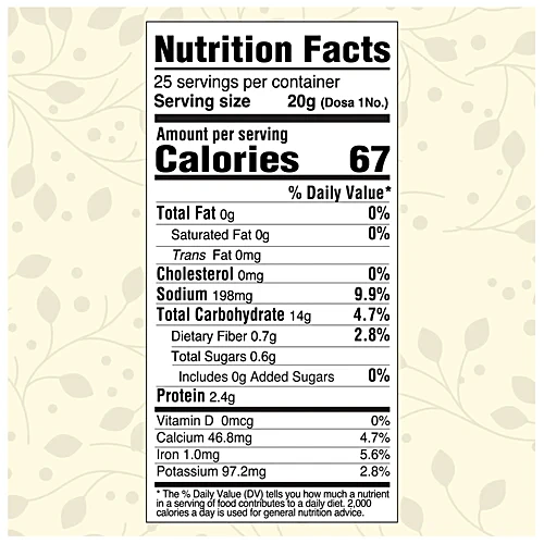 Nutrition per gram/ml: 100g Serving Size: 20g (Dosa 1No.) Calories: 67 kcal Total Fat: 0g Saturated Fat: 0g Trans Fat: 0mg Cholesterol: 0mg Sodium: 198mg Total Carbohydrate: 14g Dietary Fiber: 0.7g Total Sugars: 0.6g Includes 0g Added Sugars: 0% Protein: 2.4g Vitamin D: 0mcg Calcium: 46.8mg Iron: 1.0mg Potassium: 97.2mg