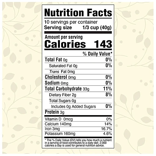 Nutrition per gram/ml: 100g Serving Size: 1/3 cup (40g) Calories: 143 kcal Total Fat: 0g Saturated Fat: 0g Trans Fat: 0g Cholesterol: 0mg Sodium: 0mg Total Carbohydrate: 33g Dietary Fiber: 2g Total Sugars: 0g Includes 0g Added Sugars: 0% Protein: 3g Vitamin D: 0mcg 0% Calcium: 140mg 14% Iron: 3mg 16.7% Potassium: 160mg 4.6%