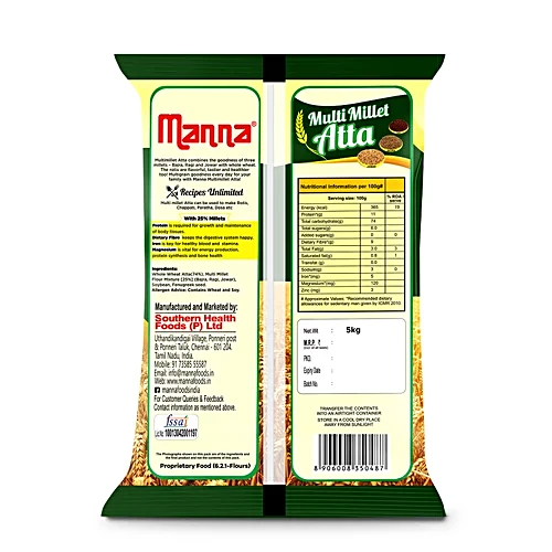 Manna Multi Millet Atta is a nutritious blend of millets like ragi, jowar, and bajra combined with whole wheat for enhanced taste and health benefits. Rich in protein, dietary fibre, iron, and magnesium, it supports overall wellness and sustained energy. With a low glycemic response, it helps in better blood sugar management. Ideal for making soft rotis, chapatis, and parathas, this wholesome atta offers a perfect balance of nutrition, taste, and everyday health.
