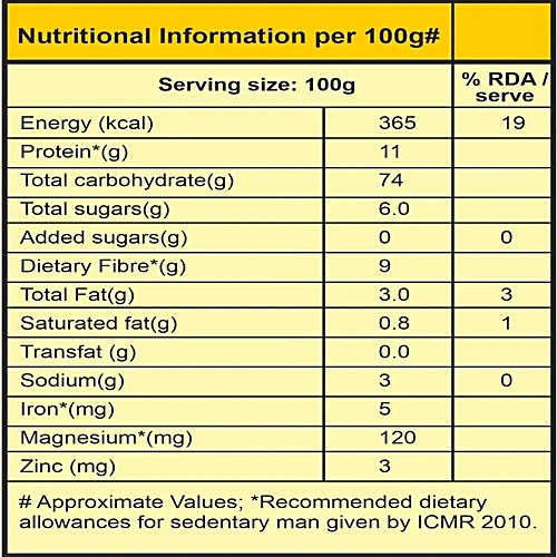 Nutrition per gram/ml: 100g Serving Size: 100g Energy (kcal): 365 Protein*(g): 11 Total carbohydrate(g): 74 Total sugars(g): 6.0 Added sugars(g): 0 Dietary Fibre*(g): 9 Total Fat(g): 3.0 Saturated fat(g): 0.8 Transfat (g): 0.0 Sodium(g): 3 Iron*(mg): 5 Magnesium*(mg): 120 Zinc (mg): 3