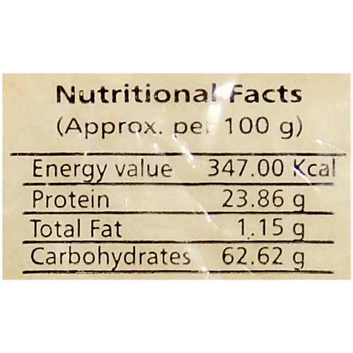 Nutrition_per: 100g Energy_value: 347.00 Kcal Protein: 23.86g Total_Fat: 1.15g Carbohydrates: 62.62g