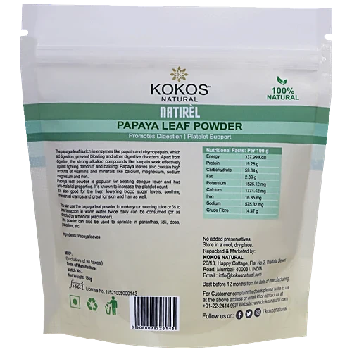 Kokos Natural Papaya Leaf Powder is a 100% pure and natural herbal supplement made from dried papaya leaves. It is traditionally used to support platelet count, improve digestion, and promote overall wellness. Rich in enzymes like papain and chymopapain, it helps reduce bloating and supports gut health. This powder also supports liver function, helps maintain healthy blood sugar levels, and promotes healthy skin and hair. Packed with essential vitamins and minerals such as calcium, magnesium, and iron, it is a great addition to your daily health routine.