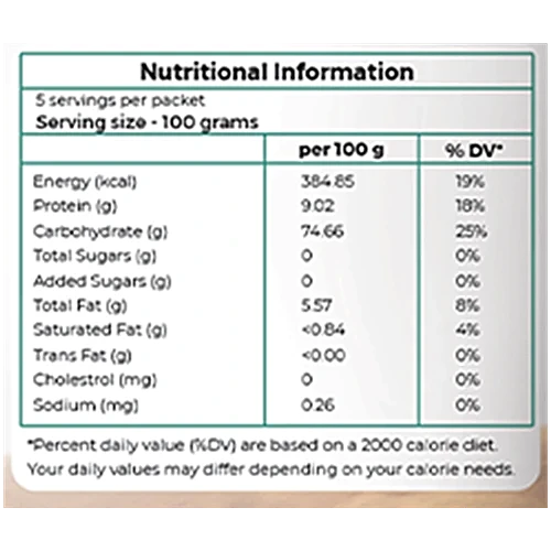 Nutrition per gram/ml: 100g Serving Size: 100 grams Energy (kcal): 384.85 Protein (g): 9.02 Carbohydrate (g): 74.66 Total Sugars (g): 0 Added Sugars (g): 0 Total Fat (g): 5.57 Saturated Fat (g): <0.84 Trans Fat (g): <0.00 Cholestrol (mg): 0 Sodium (mg): 0.26