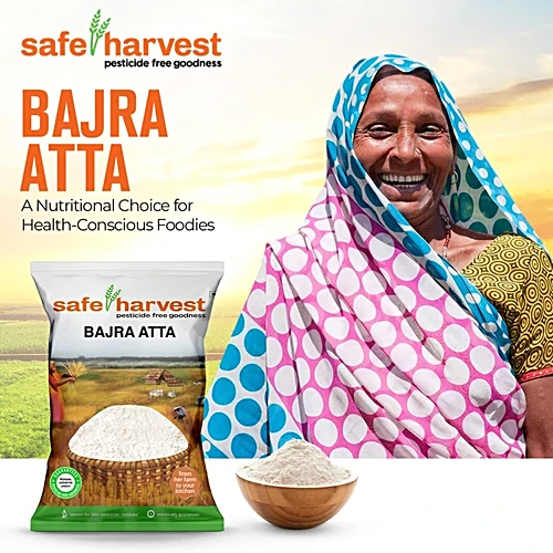 Safe Harvest Bajra Atta is a premium, pesticide-free pearl millet flour sourced from sustainable farming communities in South India. Carefully tested for purity, it ensures safe and chemical-free nutrition. Rich in fibre, essential amino acids, magnesium, and potassium, it supports heart health, digestion, and overall wellness. Naturally gluten-free and easy to digest, this wholesome bajra flour is ideal for healthy, everyday cooking and balanced nutrition.