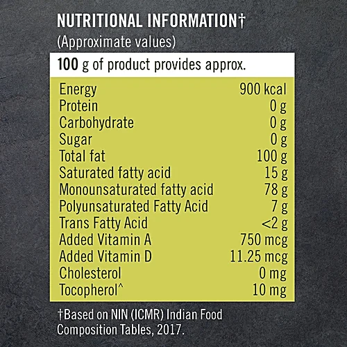 Refined Olive Oil and contains permitted antioxidants (INS 319), Antifoaming agent (INS900a), Fortified with Vitamin A& D. free from Argemone oil