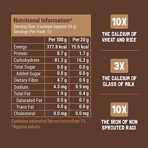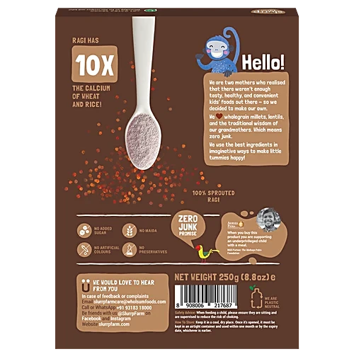Slurrp Farm Sprouted Ragi Powder is a 100% natural, organic baby food made from sprouted finger millet. Ideal for infants starting solid foods, it is rich in calcium, fibre, and essential nutrients for healthy growth. Free from maida, added sugar, salt, preservatives, and artificial flavours, this clean-label ragi powder offers safe and wholesome nutrition. Easy to prepare with milk or water, it delivers a smooth, nourishing meal in minutes. Store in an airtight container after opening to maintain freshness.
