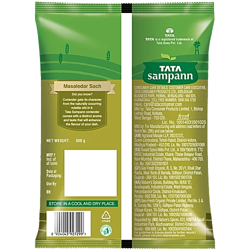 Enjoy the rich taste of Tata Sampann Coriander Powder in all your favourite dishes Coriander gets its properties and taste from its naturally occuring volatile oils These spices have the natural oils in the spices intact thus offering you sampann goodness Tata Sampann Spices contain no